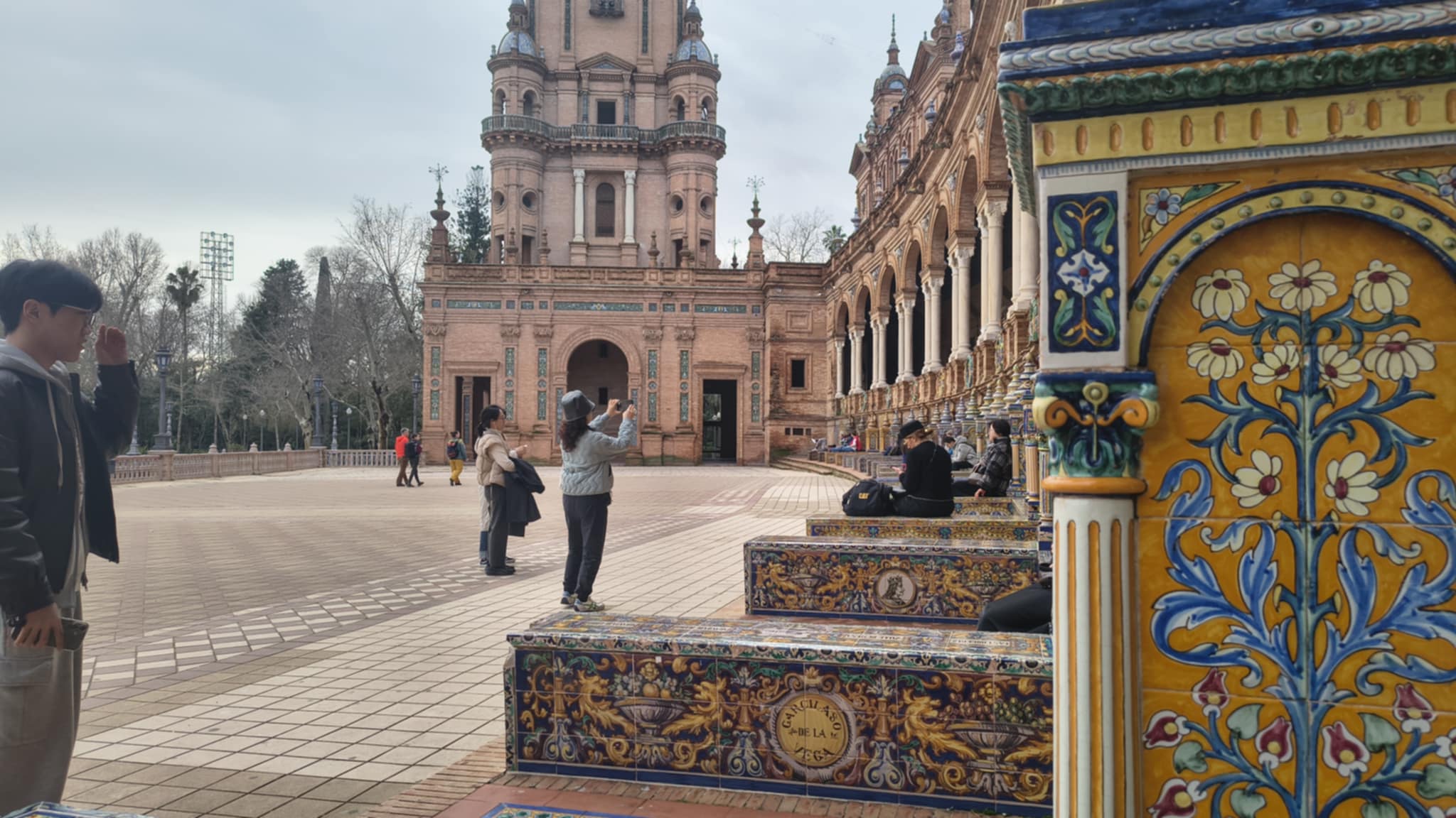 Plaza de España ma kształt półksiężyca, z centralnym kanałem, który można przepłynąć łodzią. Całość otacza monumentalny budynek zbudowany z kolorowej ceramiki, przedzielony na sektory reprezentujące różne prowincje Hiszpanii. Każda prowincja ma swoją własną ławkę, zdobioną ceramicznymi płytkami przedstawiającymi ważne wydarzenia i postaci historyczne z danej okolicy.